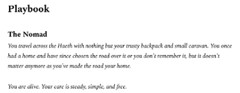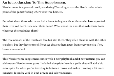 This supplement changes that up a bit and instead of focusing on finding where your home is, your home is the road itself. It also makes travelling a lot more concrete and interesting and is compatible with solo-play and group play!